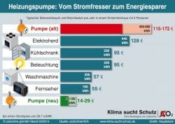 Berlin – Durch den Einbau einer modernen Heizungspumpe kann ein Hauseigentümer jährlich rund 120 Euro Stromkosten sparen. Darauf weist die vom Bundesumweltministerium geförderte Kampagne „Klima sucht Schutz“ hin. Etwa 25 Millionen dieser Geräte pumpen deutschlandweit das erwärmte Wasser vom Heizkessel in die Heizkörper. „80 Prozent der Heizungspumpen sind überaltert, ineffizient und dadurch wahre Stromfresser“, sagt Tanja Loitz, Geschäftsführerin der gemeinnützigen co2online GmbH. Diese Pumpen-Oldtimer verbrauchen mehr Strom als Fernseher und Waschmaschine zusammen. Sie arbeiten stets mit der gleichen Leistung und benötigen entsprechend viel Strom. „Wer mit wenig Aufwand viel Geld sparen will, sollte seine alte Heizungspumpe gegen eine hocheffiziente tauschen“, empfiehlt Loitz. Während alte Modelle 500 Kilowattstunden (kWh) pro Jahr verbrauchen und die Stromrechnung um 140 Euro nach oben treiben, begnügen sich Hocheffizienzpumpen mit sparsamen 75 kWh und 20 Euro pro Jahr. Diese modernen Pumpen passen sich dem tatsächlichen Bedarf an, sind elektronisch geregelt und verfügen über einen optimierten Motor. Mit dem verbesserten PumpenCheck auf www.klima-sucht-schutz.de können Hauseigentümer jetzt noch leichter und nutzerfreundlicher herausfinden, wie schnell sich ein Pumpentausch im Einzelfall rechnet.