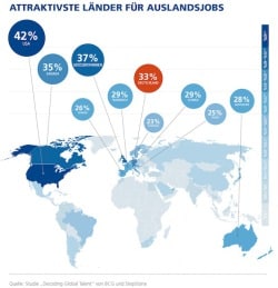 Während weltweit durchschnittlich zwei von drei Arbeitnehmern grundsätzlich bereit sind, eine Stelle im Ausland anzunehmen, würden in Deutschland weniger als die Hälfte der Arbeitskräfte für einen Job ins Ausland gehen. Das ist ein Ergebnis der aktuellen Studie Decoding Global Talent von The Boston Consulting Group (BCG), einer der weltweit führenden Strategieberatungen, und StepStone, der führenden deutschen Online-Jobbörse. Zugrunde liegt die weltweit größte Erhebung zum Thema Jobmobilität, bei der zwischen April und Juni 2014 mehr als 200.000 Arbeitskräfte aus 189 Ländern befragt wurden.
