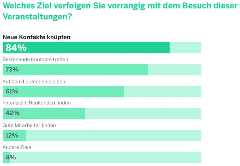 Die überwiegende Mehrheit der befragten deutschen Wirtschaftsakteure ist bei einem der beiden großen Online-Businessnetzwerke angemeldet und nutzt sie mehrmals in der Woche fürs Networking. Dieses digitale Netzwerken scheint die Rolle von Geschäftsveranstaltungen jedoch nicht zu schmälern: 79 Prozent der Studienteilnehmer sagen, dass Business Events wichtig für den Erfolg ihres Unternehmens sind, und weitere 88 Prozent meinten, dass sich die Bedeutung von Veranstaltungen in den vergangenen zehn Jahren auch nicht geändert hat, bzw. dass sie noch wichtiger geworden sind.