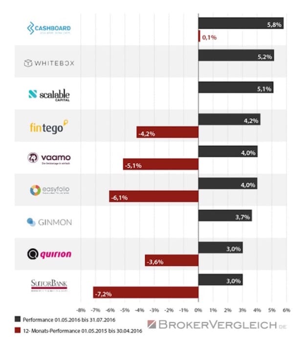 In der Quartalsansicht (Mai bis Juli 2016) liegen sämtliche Anbieter deutlich im Plus. Über der 5-Prozent-Grenze finden sich cashboard (+5,8 %), Whitebox (+ 5,2 %) sowie Scalable.Capital (+5,1 %).