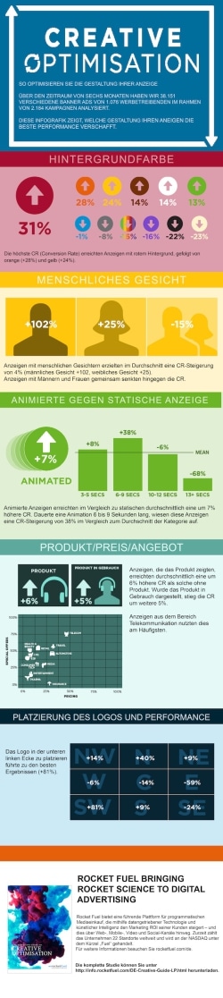 Redwood City / Kalifornien – Rocket Fuel, ein führender Technologieanbieter für digitale Werbelösungen, hat heute die Veröffentlichung seines Guide To Creative Optimization bekannt gegeben. Die Analyse quantifiziert den Einfluss von bestimmten Design-Entscheidungen auf die Wirksamkeit von Anzeigen. Sie zeigt: strategische Entscheidungen in der Gestaltung können die Conversion Rates in manchen Branchen um mehr als 600 % steigern. Zudem konnte für einzelne Branchen der Einfluss des Inhalts der Werbebotschaft analysiert werden.