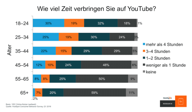 Die Studie zeigt auch, dass Video-Content Menschen aller Altersgruppen erreicht: Von den befragten Internet-Nutzern sehen sich 45 Prozent mindestens eine Stunde pro Woche Videos auf Facebook oder YouTube an. Als Faustregel gilt: Je jünger, desto mehr Zeit verbringen YouTube-Nutzer auf der Plattform. Von den 18- bis 24-Jährigen nutzen 99 Prozent die Video-Plattform und selbst von den Senioren sind es noch 89 Prozent.