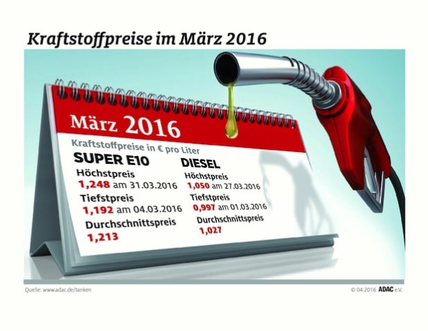 Wer Benzin tankt, konnte vor allem am 4. März sparen. Hier kostete der Liter Super E10 durchschnittlich 1,192 Euro. Am teuersten war der 31. März mit 1,248 Euro.