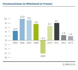 Die mittelständischen Unternehmen haben ihren Umsatz im vergangenen Jahr um 1,9 % erhöht – trotz steigendem Wettbewerbsdruck und hoher Unsicherheit. Das ist positiv. Allerdings nimmt das Wachstum gegenüber dem Jahr 2012 um ein Fünftel ab. Kein Segment findet im Jahr 2013 zurück zu früherer Wachstumsstärke. Mittelfristig ist nur mit wenig Belebung zu rechnen. Die Geschäftserwartungen werden nochmals nach unten korrigiert.