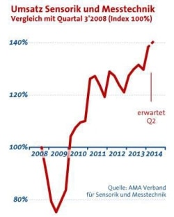 Der AMA Verband für Sensorik und Messtechnik befragt seine 480 Mitglieder quartalsweise zur wirtschaftlichen Entwicklung. Nach einem soliden Jahresergebnis im zurückliegenden Geschäftsjahr, verzeichnet die Branche im ersten Quartal 2014 einen Umsatzschub von sieben Prozent, verglichen mit dem Ergebnis des Vorquartals.